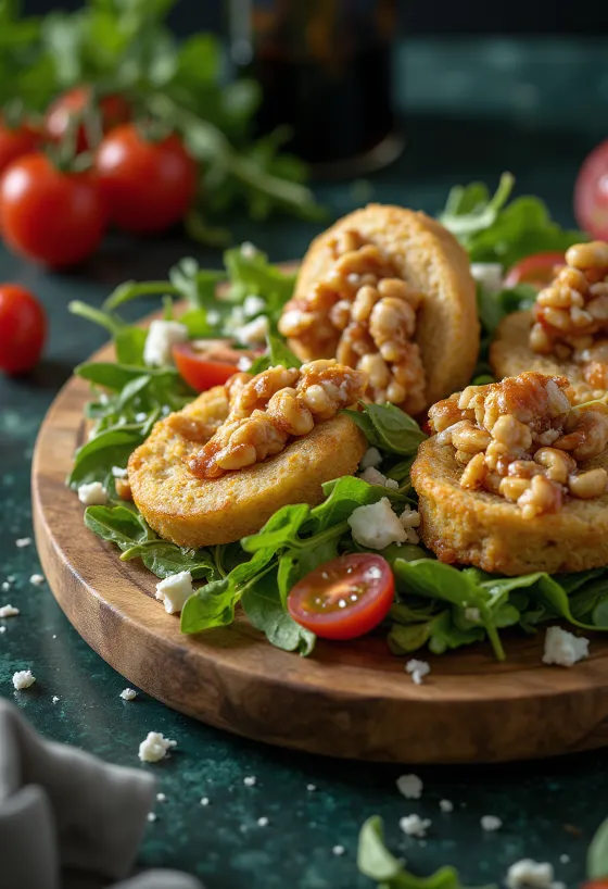 Skär den färdiga, ljumna kakan i ringar eller tärningar och blanda med salladen. Servera genast.